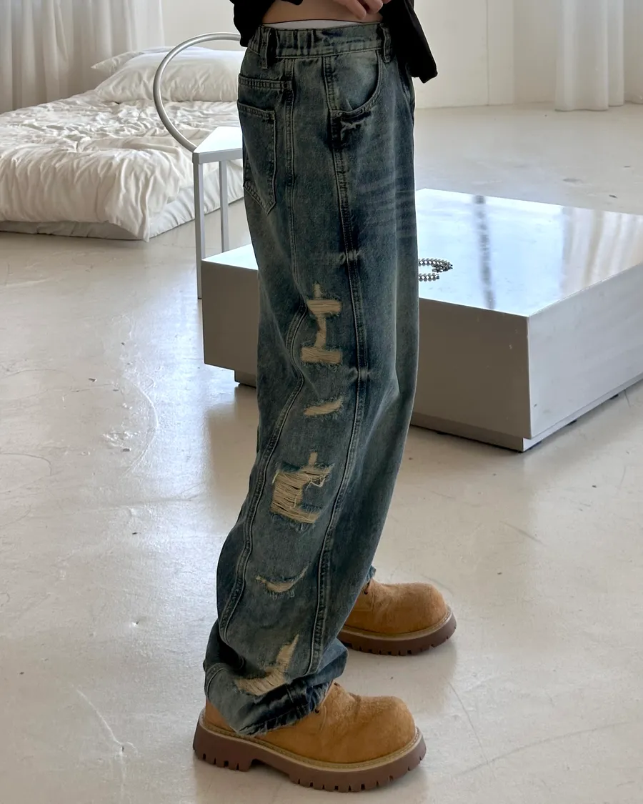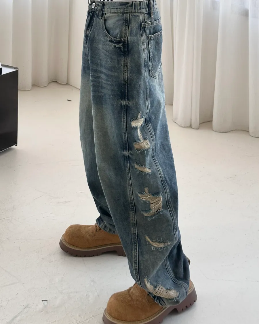 REVO 不對稱刷破鬆緊錐形褲